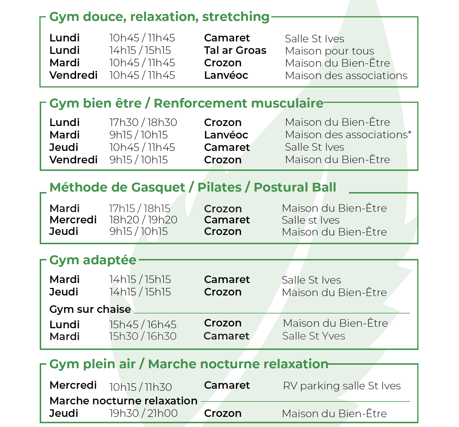 Tous les mercredis nous nous donnons rendez-vous à 10h00 salle St Ives à Camaret pour 1h30 d’exercices physiques en plein air par tous les temps.